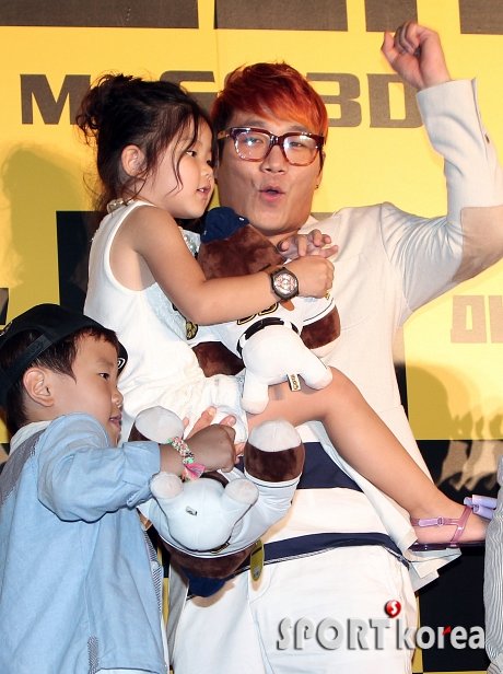 ‘아빠 어디가’에 출연중인 가수 윤민수가 9일 오후 서울 코엑스 메가박스에서 열린 영화 ‘미스터고’(감독 김용화) VIP 시사회에 참석해 성동일의 딸 빈양을 안고 파이팅을 외치고 있다.