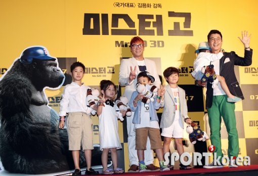 ‘아빠 어디가’ 팀이 9일 오후 서울 코엑스 메가박스에서 열린 영화 ‘미스터고’(감독 김용화) VIP 시사회에 참석해 출연배우 성동일을 응원하고 있다.