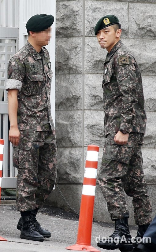 군복무중인 가수 비(정지훈)가 전역했다. 비가 10일 오후 서울 용산구 국방부 국방홍보원 앞에서 전역하고 나오고 있다. 이날, 연예병사 기강 해이 등 논란 탓에 전역 기념행사와 기자회견은 열리지 않았다.
