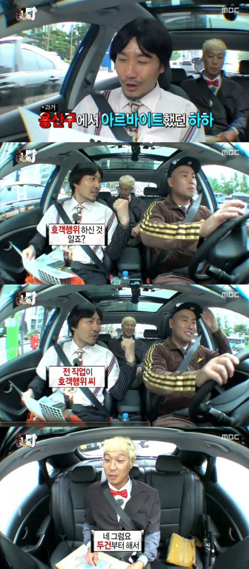 노홍철, 하하, 길이 정준하 팀으로 유재석, 박명수, 데프콘이 정형돈 팀으로 구성돼 각 팀이 자가용으로 움직였다. 노홍철 하하 길이 용산구를 향하던 중 “하하씨가 용산구를 잘 안다. 용산구는 하하 씨의 일자리 투어”라며 “예전에 호객행위를 했다. 전 직업이 호객행위 씨”라고 말했다.