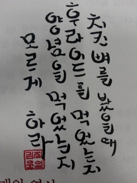 최근 한 인터넷 커뮤니티 게시판에는 ‘치킨에 대한 명언’이라는 제목으로 한 편의 붓글씨가 공개돼 눈길을 끌었다.
