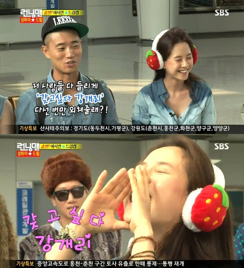 송지효는 지난 주 레이스에서 진 팀에 속해 겨울옷을 입는 벌칙을 수행해야 했다. 귀마개를 벗고 싶다는 송지효에게 이긴 팀에 속했던 개리는 “사람들 앞에서 ‘갖고싶다 강개리’를 5번 외쳐라”고 말했다. 이에 송지효는 응했고 개리는 흐뭇한 웃음을 지었다.