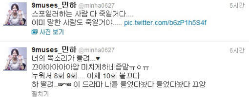 민하는 14일 자신의 트위터에 “너의 목소리가 들려.. 끄아아아아아앙 미치게 하네 정말. 누워서 8회 9회.. 이제 10회 볼 거다. 하 떨려.. 이 드라마 나를 들었다놨다 들었다놨다”고 남겼다.