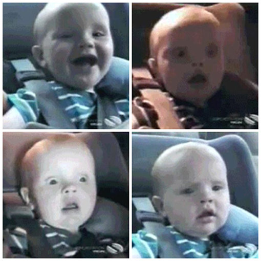 영상에는 기분 좋은 얼굴로 차를 타고 가다가 터널로 들어서가 아기의 얼굴은 마치 공포 영화의 한 장면을 본 듯한 표정을 짓는다.