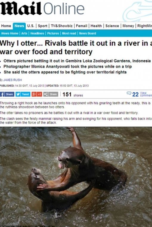 이 ‘주먹을 날리며 싸우는 수달’사진은 인도네시아의 사진작가 모니카 아난트요와티가 촬영한 것이다. 그는 “수달은 3분 정도 물 속에서 치열한 싸움을 벌였다. 그 이유는 영역 다툼으로 보인다”고 전했다.