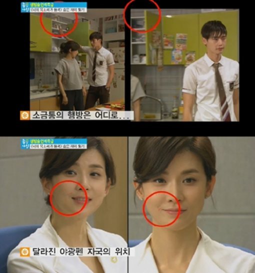 또 12일 방송된 ‘너목들’ 3회에서는 법정에서 열심히 변호하던 장혜성 얼굴에 야광 펜 자국이 있어서 박수하가 계속 쳐다보는 장면이 나왔다. 그러나 이후 야광 펜 자국의 위치가 저절로 바뀐 것.