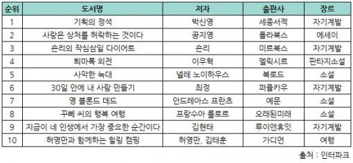 이번 주에는 자기계발서가 다수 베스트셀러 상위권을 차지했으며, 여름 휴가를 대비해 다이어트와 여행 관련 도서들도 인기를 끌었다. ‘숀리의 작심삼일 다이어트’는 스타강사 숀리가 자신의 다이어트 노하우와 즐겁게 운동하는 방법을 접목해서 쓴 자기계발서다. ‘허영만과 함께하는 힐링 캠핑’은 허영만 화백과 프로 여행가들이 함께 캠퍼밴을 타고 뉴질랜드를 여행한 내용을 담은 에세이다.
