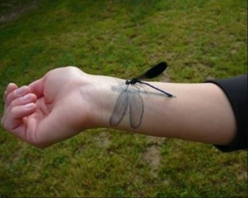 사진 속의 잠자리는 어떤 이의 팔목에 내려앉은 모습이다. 사진 속 사람의 팔목에는 이 잠자리와 흡사한 잠자리 문신이 있어 잠자리가 자신의 모습인 줄 안 것 같은 모양이다.
