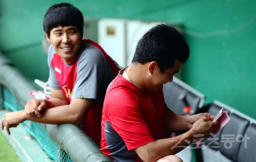 16일 오후 인천 문학야구장에서 ‘2013 한국야쿠르트 세븐 프로야구’ SK 와이번스와 넥센 히어로즈의 경기가 열린다. 경기전 SK 정근우가 스마트폰으로 날씨를 검색하고 있다.