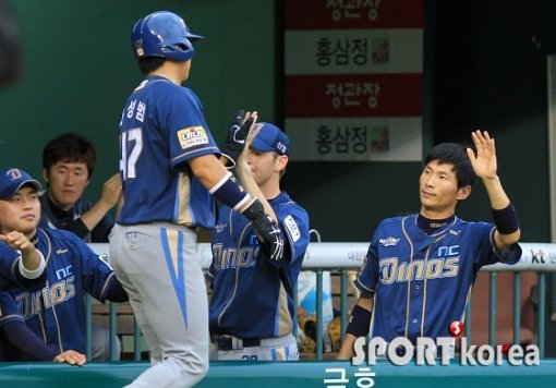 16일 오후 서울 잠실구장에서 열린 ‘2013 한국야쿠르트 세븐 프로야구’ 두산 베어스와 NC 다이노스의 경기 NC 1회초 2사 1,3루에서 5번 모창민의 적시타 때 3루주자 나성범이 선취득점을 올리고 덕아웃에서 동료의 환영을 받고 있다.
