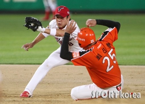 ‘2013 한국야쿠르트 세븐 프로야구’ KIA 타이거즈와 한화 이글스의 경기가 16일 오후 광주 무등야구장에서 열렸다. 5회초 1사 1루에서 한화 김태균 타석 때 1루주자 최진행이 KIA 선발 김진우의 폭투로 포수 김상훈이 볼을 놓친 사이 도루를 성공시키고 있다.