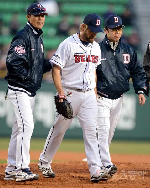 게릿 올슨(가운데)은 두산이 올 시즌을 겨냥해 야심 차게 영입한 좌완투수였다. 그러나 부상과 부진 등으로 결국 짐을 쌌다. 두산은 올슨을 대신해 우완투수 데릭 핸킨스를 영입했다. 스포츠동아DB