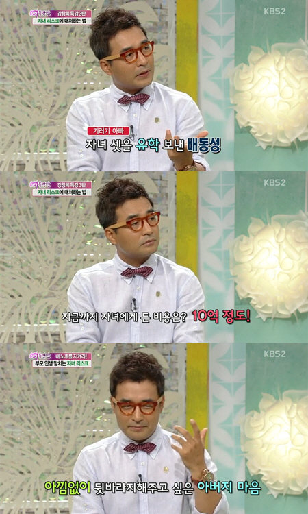이날 MC 조영구는 배동성에게 "기러기 아빠 생활을 오래 하고, 늦둥이도 있지 않으냐. 지금도 큰아들이 유학 중인데 그동안 돈 많이 들지 않았느냐"고 물었다.