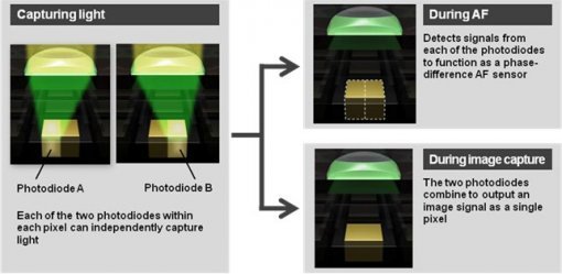 센서의 촬상소자 하나를 둘로 나눠 각각의 소자가 빛 정보를 받아들이고 이것이 위상차 센서처럼 작동해 초점을 맞춘다. 이런 소자가 이미지 전체에 박혀있다. 캐논 관계자의 표현을 빌리자면