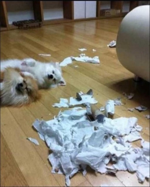 개제된 사진 속에는 갈기갈기 찢어진 휴지 조각이 지저분하게 흩어져 있다. 그 옆에는 강아지 두 마리가 눈을 꼭 감고 누워 있었다. 마치 자신들은 전혀 모르는 일이라며 시치미를 떼는 것처럼 보여 웃음을 자아냈다.
