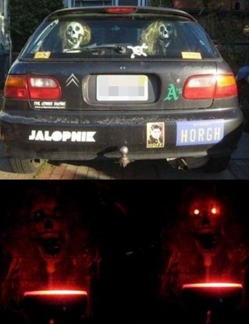 '뒤차 졸음운전 방지' 사진에는 자동차 뒤에 해골 인형이 매달려 있어 눈길을 끌었다. 특히 밤이 되자 붉은 조명등이 켜지면 오싹함을 더했다.