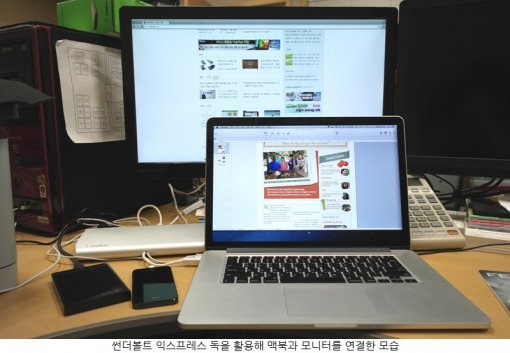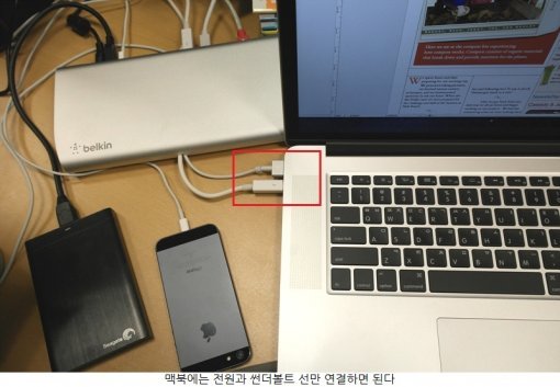 확장 단자의 개수에 아쉬움을 느끼는 맥북 사용자를 위해 액세서리 전문기업 벨킨이 나섰다. 벨킨은 맥북의 썬더볼트 단자에 연결해 확장 단자의 개수를 늘릴 수 있는 제품 ‘썬더볼트 익스프레스 독’을 출시했다. 썬더볼트란 인텔과 애플이 함께 개발한 규격으로, DP(디스플레이포트)와 USB3.0 그리고 전원 케이블을 하나로 뭉쳐놓은 확장 단자다.