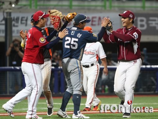 `2013 프로야구 퓨처스리그 올스타전` 18일 오후 5시 경북 포항야구장에서 열려 남부리그가 북부리그에 4대 3으로 승리를 거뒀다. 경기종료 후 남부리그 선수들이 그라운드 위에서 승리의 기쁨을 나누고 있다.