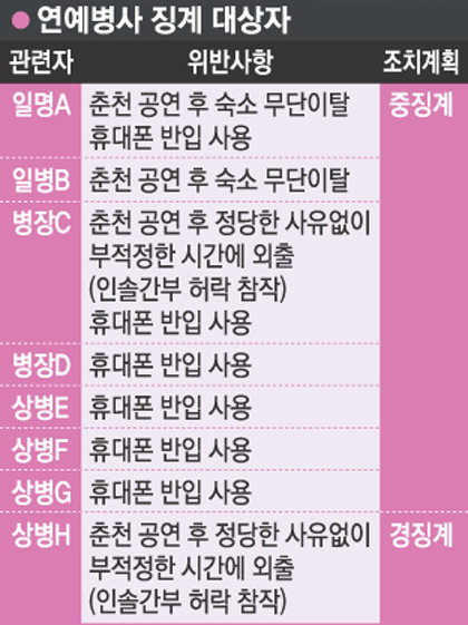 병장 C와 상병 H는 국방홍보원 인솔 간부의 묵인 하에 야식을 먹은 뒤 숙소를 나와 영화를 보고 숙소로 복귀했다. 연예병사 6명은 국방홍보원 대기실에 개인 휴대전화를 무단 반입해 사용했고, 국방홍보원 홍보지원대 담당자 두 명은 이를 알고도 묵인했다.