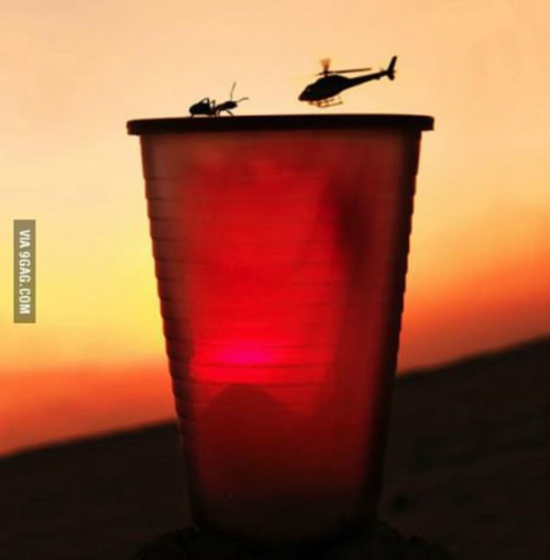 사진은 노을을 배경으로 종이컵 위에 개미가 올라있다. 그리고 저 멀리에 헬리콥터가 포착됐는데 이 모습이 마치 개미와 승부를 겨루는 모습처럼 담겨 있다. 이 사진은 원근감을 이용해 헬리콥터와 개미의 크기를 비슷하게 맞춘 사진이다.