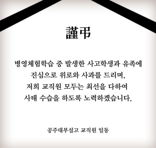공주사대부고 교직원 일동은 ”병영체험학습 중 발생한 사고학생과 유족에 진심으로 위로와 사과를 드리며, 저희 교직원 모두는 최선을 다하여 사태 수습을 하도록 노력하겠습니다”라고 남겼다.