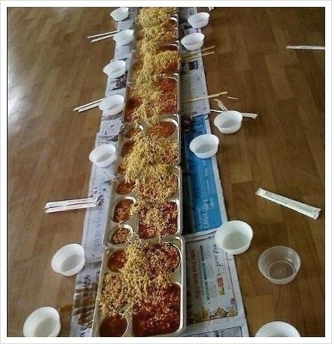 사진에는 군대에서 사용하는 식판을 일렬로 이어 붙인 다음 그 위에 라면을 부어놓은 모습이다. 인원이 많은 군대에서 대량으로 끓일 경우 먹는 방법이다.