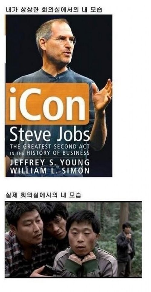 ‘내가 상상한 회의실에서의 내 모습’은 스티브 잡스가 과거 애플 CEO 시절에 당당하고 자신감 넘치게 연설하는 모습이 담겨 있다. 반면 ‘실제 회의실에서의 내 모습’은 영화 ‘살인의 추억’ 속 백광호(박노식 분)의 모습이다.