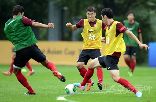 공격수와 수비수로서 두 번 대표팀 유니폼을 입는 ‘오뚝이’ 고요한(가운데)이 2013 EAFF동아시안컵 중국과의 경기를 앞두고 22일 파주 NFC에서 벌어진 팀훈련에 참가해 땀을 흘리고 있다. 파주|김민성 기자 marineboy@donga.com 트위터@bluemarine007