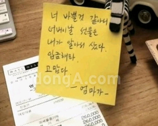 엄마는 아들에게 “너 바쁠 것 같아서 어버이날 선물은 내가 알아서 샀다. 입금해라. 고맙다. 엄마가”라고 메모를 남겼다. 이어 메모 옆에서는 어머니가 구매하신 뒤 받은 영수증이 눈길을 끈다. 어머니는 26만원 어치의 의류를 구입하신 것.