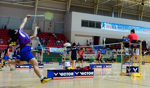 ‘제2의 이용대를 꿈꾼다!’ 22일 전남 화순 하니움문화스포츠센터에서 열린 ‘이용대 올림픽 제패 기념 2013 화순-빅터 전국학교대항 배드민턴선수권대회’ 초·중·고등학교 단체전 예선에서 한 선수가 힘차게 스매싱을 하고 있다. 화순|박화용 기자