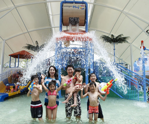 실내외 워터파크와 실내 스키장, 스노우파크를 모두 갖춘 도심형 테마파크 웅진플레이도시는 여름을 맞아 ‘오리지널 난타’ 공연 등 다양한 즐길거리를 준비했다. 가족단위 이용객이 아쿠아풀에서 물놀이를 즐기고 있다. 사진제공|웅진플레이도시
