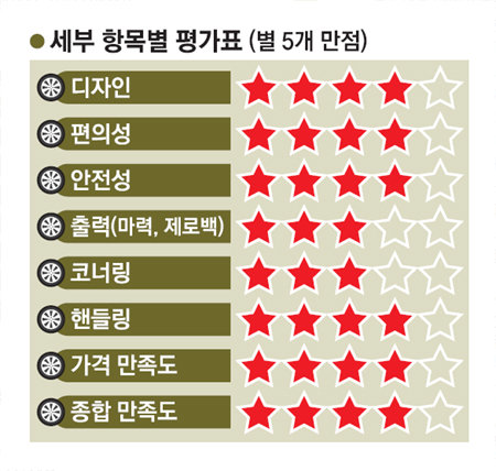 50자평 “무겁게 밟히는 페달이 제동시 안정감을 더해준다. 브레이크 내구성도 뛰어난 편. 다만 승차감 위주 세팅 때문에 코너링은 다소 아쉽다”