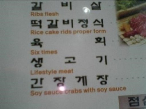 사진은 한 식당의 메뉴판을 촬영한 것으로 외국인을 위한 영어 메뉴에 오역이 있음을 알리고 있다.