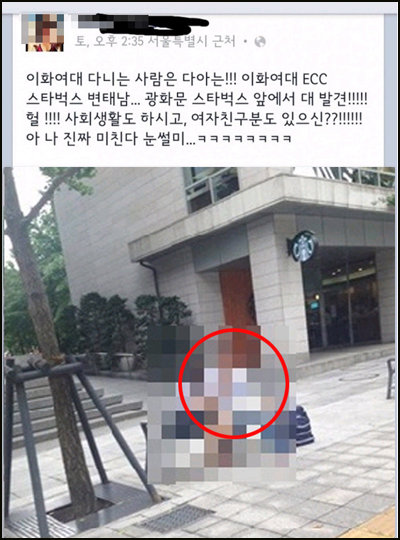 지난 20일 이 학교 대학원생인 정 모씨는 자신의 페이스북에 “이화여대 다니는 사람은 다 아는! 이화여대 ECC 스타벅스 변태남. 광화문 스타벅스 앞에서 대 발견! 헐! 사회생활도 하시고, 여자친구 분도 있으신? 아 나 진짜 미친다 눈썰미”라는 글을 올렸다.