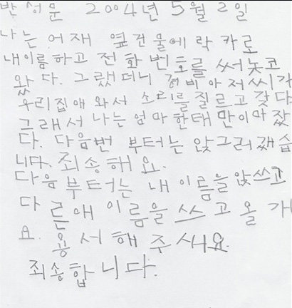 이어 "다음부터는 안그러겠습니다. 다음 부터는 내 이름을 안 쓰고 다른애 이름을 쓰고 올께요. 용서해 주세요"라고 적어 웃음을 자아냈다.