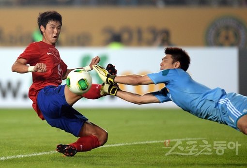 24일 화성종합경기타운에서 열린 동아시안컵 한국-중국전에서 서동현(왼쪽)이 슛을 시도하는 순간 상대 골키퍼가 먼저 펀칭하고 있다. 화성|김종원 기자 won@donga.com트위터@beanjjun