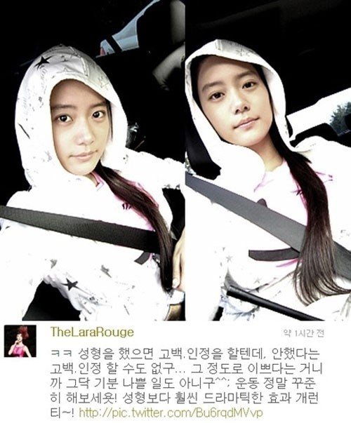 클라라는 25일 자신의 트위터에 “성형을 했으면 고백, 인정을 할 텐데 안 했다는 고백, 인정 할 수도 없고. 그 정도로 예쁘다는 거니까 그다지 기분 나쁠 일도 아니고. 운동 정말 꾸준히 해보세요! 성형보다 훨씬 드라마틱한 효과 개런티~!”라는 글과 함께 민낯 셀카를 공개했다.
