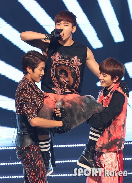 인피니트 호야(가운데)가 25일 오후 서울 상암동 CJ E&M에서 열린 ‘Mnet 엠카운트다운’(엠카)에 출연해 1위를 차지한 후 가마를 타고 팬들에게 감사인사를 전하고 있다.