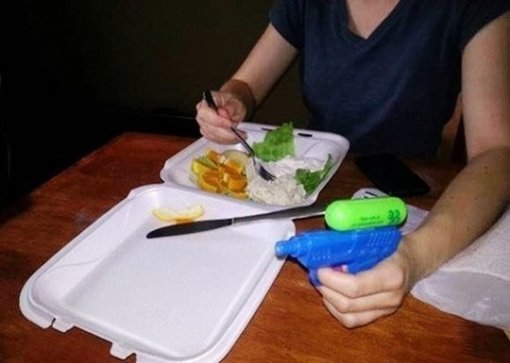 공개된 사진 속에는 한 여성이 오른 손으로는 밥을 먹고 왼손에는 물총을 쥐고 있는 모습이 담겨있다.