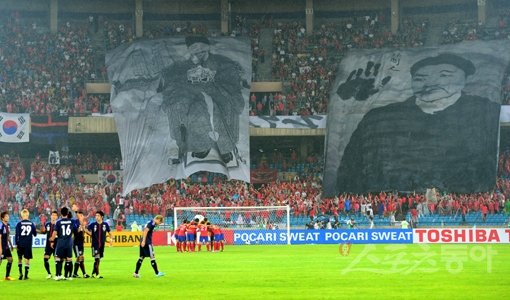 이날 붉은악마가 준비한 대형 펼침막은 3개. 하나는 이순신과 거북선이 그려진 것이었고, 다른 하나는 안중근이 그려진 대형 걸개였다. 이순신 장군은 임진왜란 당시 왜구를 물리친 성웅이었고, 안중근 의사도 1905년 을사늑약으로 조선의 외교권이 강탈당하면서 4년 뒤 이토 히로부미를 저격한 민족 영웅이다. 일본전을 맞아 2개의 걸개를 특별 제작했다. 붉은악마는 오후 4시를 넘겨 응원석 1, 2층을 가득 덮는 2개의 걸개를 펼쳐보며 준비에 열을 올렸다.