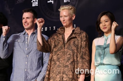 배우 크리스 에반스, 틸다 스윈튼, 고아성(왼쪽부터)이 29일 오전 서울 여의도 콘래드호텔에서 영화 ‘설국열차’ 공식 기자회견에 참석해 포토타임을 하고 있다. 봉준호 감독이 연출한 설국열차는 인류 마지막 생존지역인 열차 안에서 억압에 시달리던 꼬리칸 사람들의 반란을 그렸다.