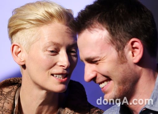 배우 틸다 스윈튼(왼쪽)과 크리스 에반스이 29일 오전 서울 여의도 콘래드호텔에서 영화 ‘설국열차’ 공식 기자회견에서 담소를 나누고 있다. 봉준호 감독이 연출한 설국열차는 인류 마지막 생존지역인 열차 안에서 억압에 시달리던 꼬리칸 사람들의 반란을 그렸다.