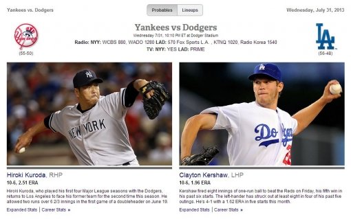 내셔널리그를 대표하는 클레이튼 커쇼(25·LA 다저스)와 베테랑의 연륜을 보여주고 있는 구로다 히로키(38·뉴욕 양키스)가 정면충돌한다.