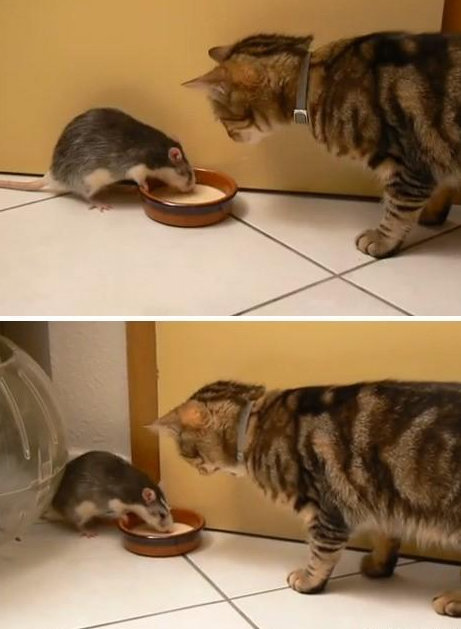 이렇게 신경전을 벌인 후 결국 음식을 차지한 것은 쥐였다. 쥐에게 밥을 뺏긴 고양이는 슬그머니 꽁무니를 빼고 말았다.