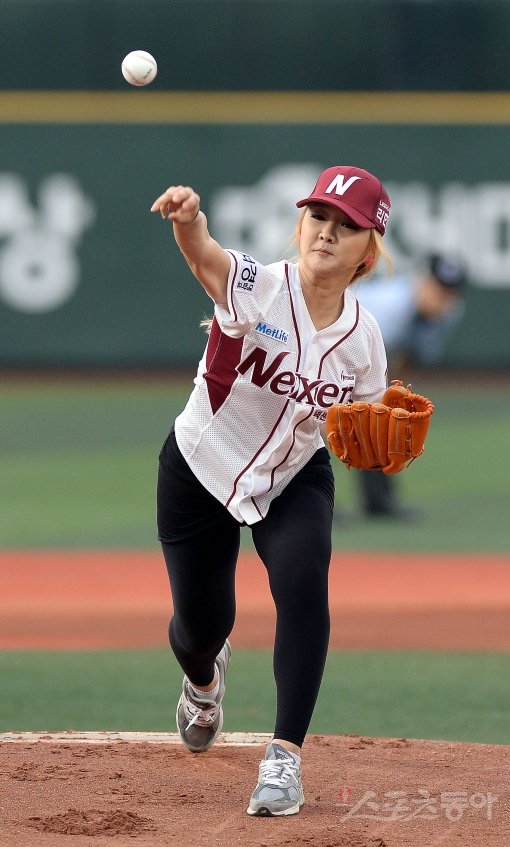 ‘2013 한국야쿠르트 세븐’ 프로야구 한화이글스 대 넥센히어로즈 경기가 30일 서울 목동야구장에서 열렸다. 경기 전 가수 성수진이 시구를 하고 있다.