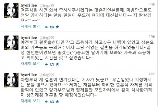 이효리는 31일 자신의 트위터를 통해 “아침부터 제 결혼이 연기됐다는 기사가 났군요. 무슨 일 있나 걱정하시는 분들 많으시겠어요. 저희는 처음부터 화려한 결혼식 자체를 계획한 적이 없었고 양가 부모님과 형제들만 모인 자리에서 같이 식사 한 끼 하며 상견례 겸 결혼을 할 예정이었습니다”라고 밝혔다.