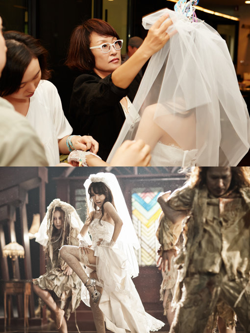 이번 의상은 신곡‘V’(브이)에 걸맞는‘발랄한 웨딩신부’ 컨셉트로 이전에 공개했던 다크한 이미지에서 벗어나 발랄하고 다이나믹한 이미지에 집중했다.