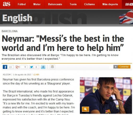 지난 1일(현지시각) 스페인 언론 ‘AS’에 따르면 네이마르는 “메시는 세계 최고의 선수다. 난 그를 돕기 위해 바르셀로나에 왔다”고 밝혔다.