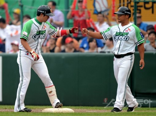 4일 오후 인천 문학야구장에서 ‘2013 한국야쿠르트 세븐 프로야구’ SK 와이번스와 두산 베어스의 경기가 열렸다. 1회말 1사 3루에서 SK 최정이 1타점 적시타를 치고난 뒤 정경배 코치의 환영을 받고 있다.
