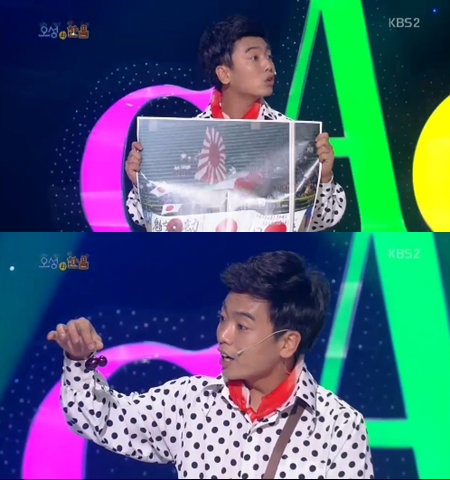 4일 방송된 KBS 2TV ‘개그콘서트’의 ‘오성과 한음’코너에서는 지난 7월 28일 잠실종합운동장에서 열린 동아시안컵 한일전에서 일본 팬들이 내걸었던 욱일승천기에 대해 언급했다.